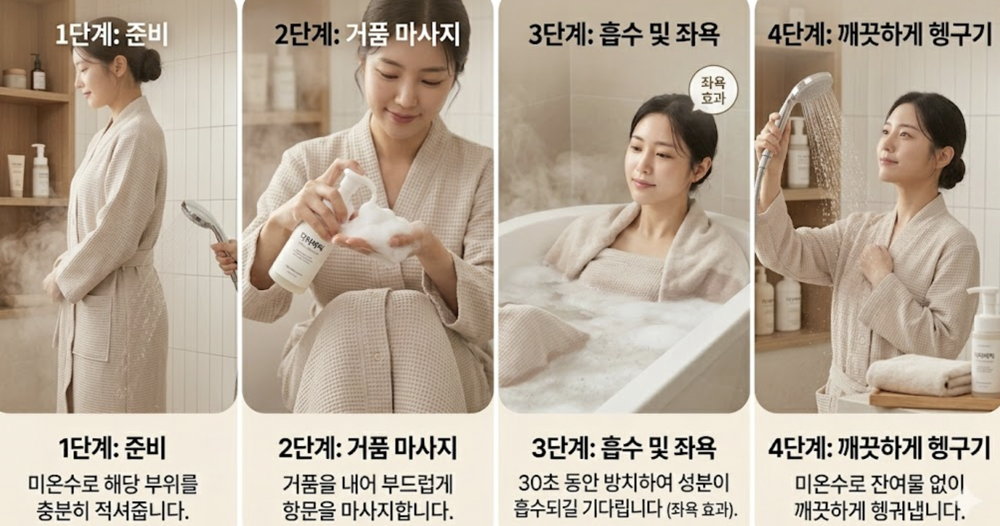 - 바로 헹구지 말고 30초 정도 방치하여 성분이 흡수되길 기다립니다. (이때 좌욕 효과가 좋아요)