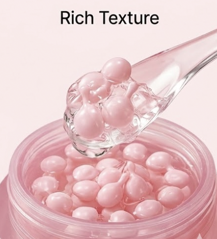 처음 배송을 받고 열어봤을 때 핑크빛 캡슐들이 알알이 박혀있는 모습이 인상적이었어요. 발림성은 생각보다 부드러웠고 손끝에서 캡슐이 톡톡 터지면서 피부에 녹아드는데 흡수되고 나면 끈적임보다는 은은한 광택이 도는 느낌이었어요.