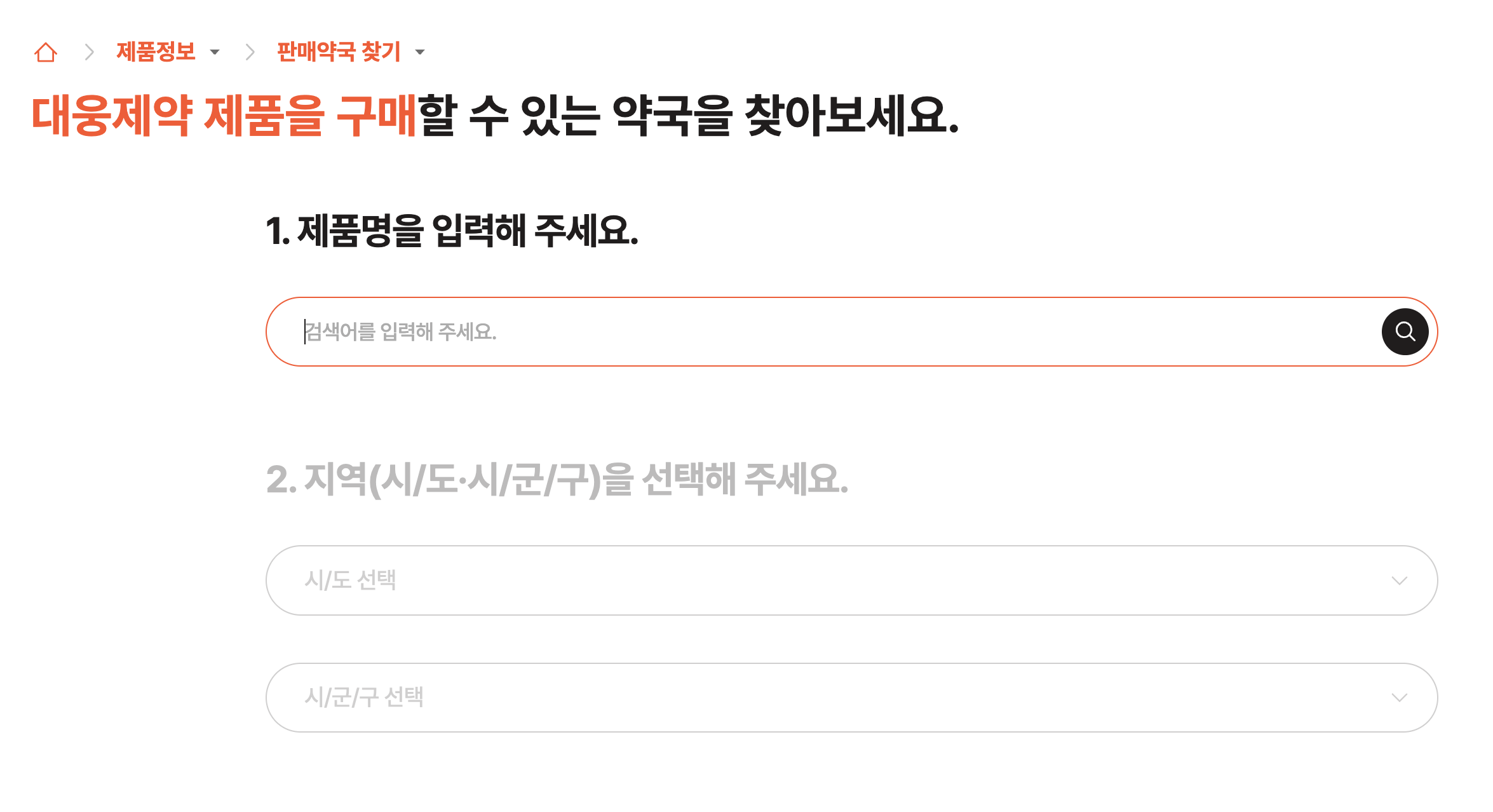 4.아래에서 지역(시/도·시/군/구)을 선택할 수 있는데요. 거주하시는 지역과 '구'를 선택하고 약국찾기를 선택하세요.